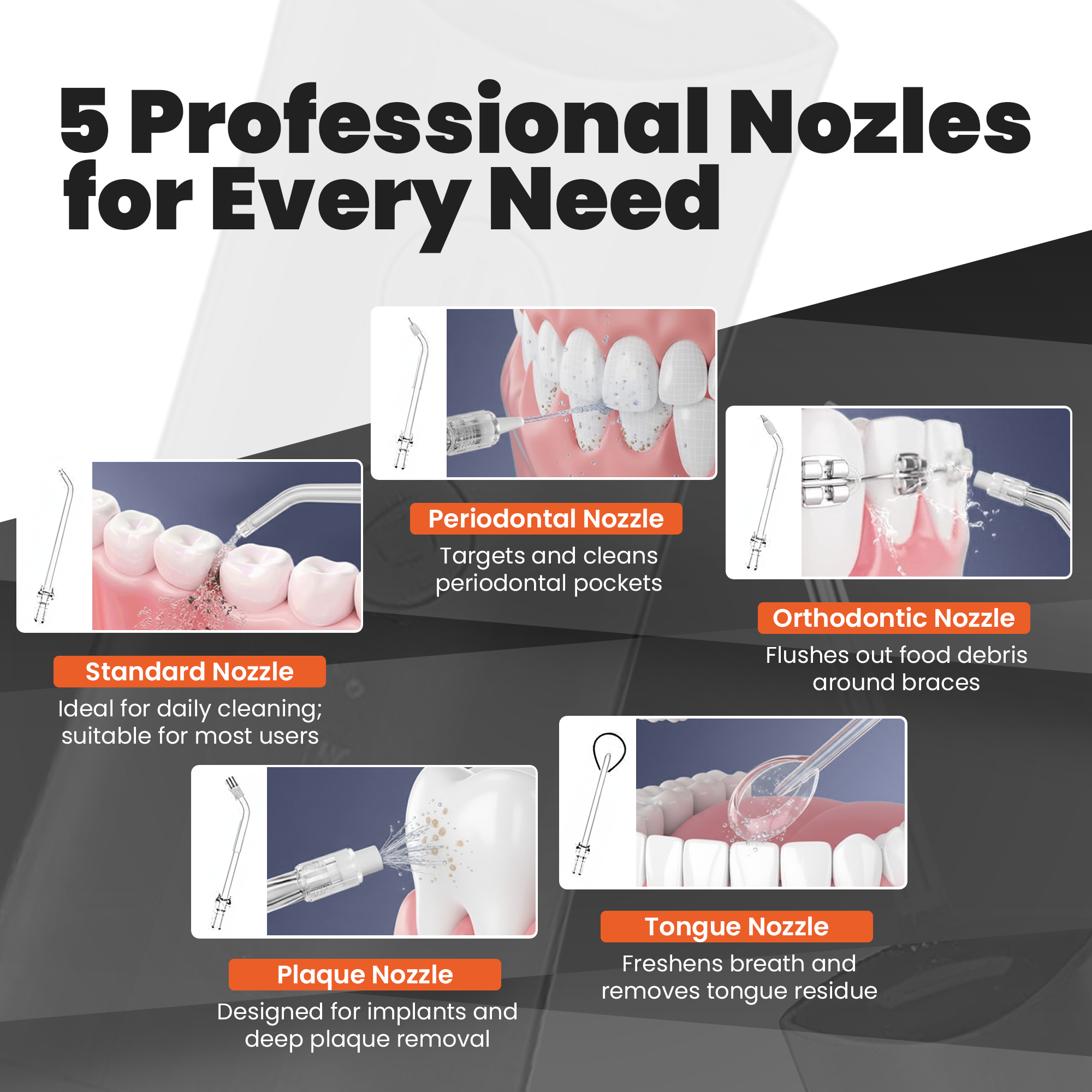 - Erweiterte Reinigungskraft: Liefert einen gezielten Wasserstrahl, um Plaque und Ablagerungen zu entfernen, verbessert die Gesundheit des Zahnfleischs und beugt Karies vor.